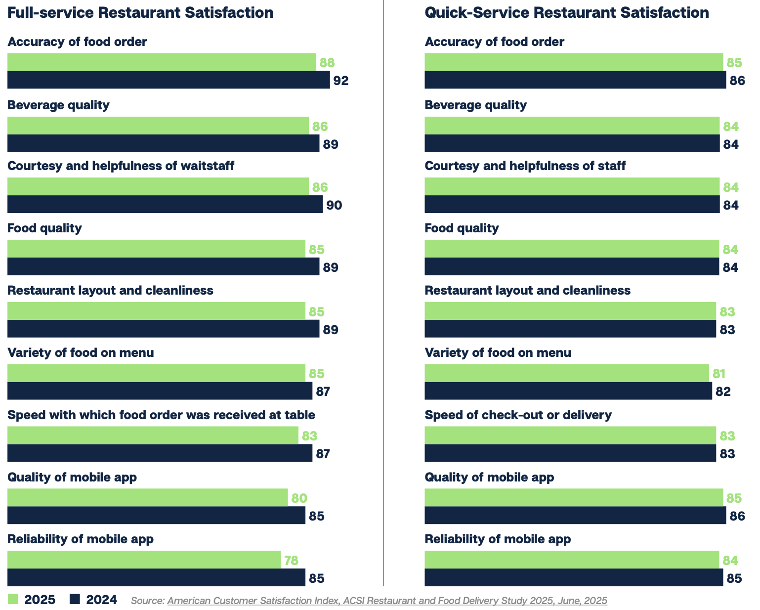 The latest research from the American Customer Satisfaction Index, however, shows that even top establishments are falling behind in these key areas, both across full-service establishments and QSRs. The report found, for example, that satisfaction with staff courtesy and helpfulness fell 4 points for the full-service segment between 2024 and 2025.