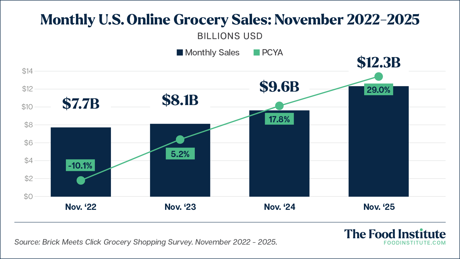 U.S. online grocery sales grew 29% year-over-year in November, reaching $12.3 billion according to the latest data from Brick Meets Click. The segment’s growth isn’t stopping, but the forces driving its success are changing.