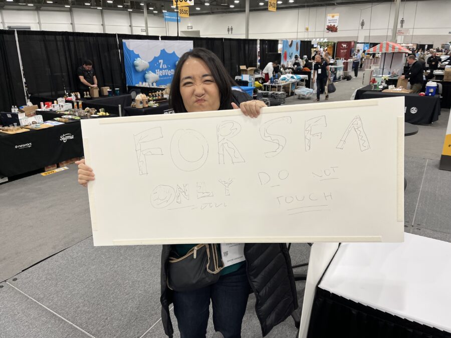 After our chairs and tables disappeared at setup, The Food Institute team crafted a crude but effective warning sign, citing the power of the Specialty Food Association. Beware, all who enter here!