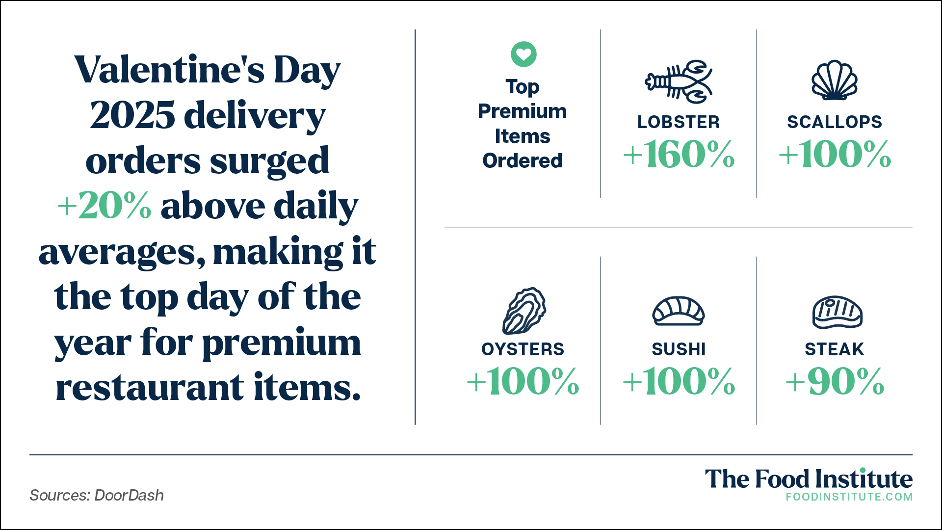 According to DoorDash, delivery volume spiked +20% above the daily average on Valentine’s Day 2025, which was the number-one day out of the whole year for restaurant orders featuring premium items like: