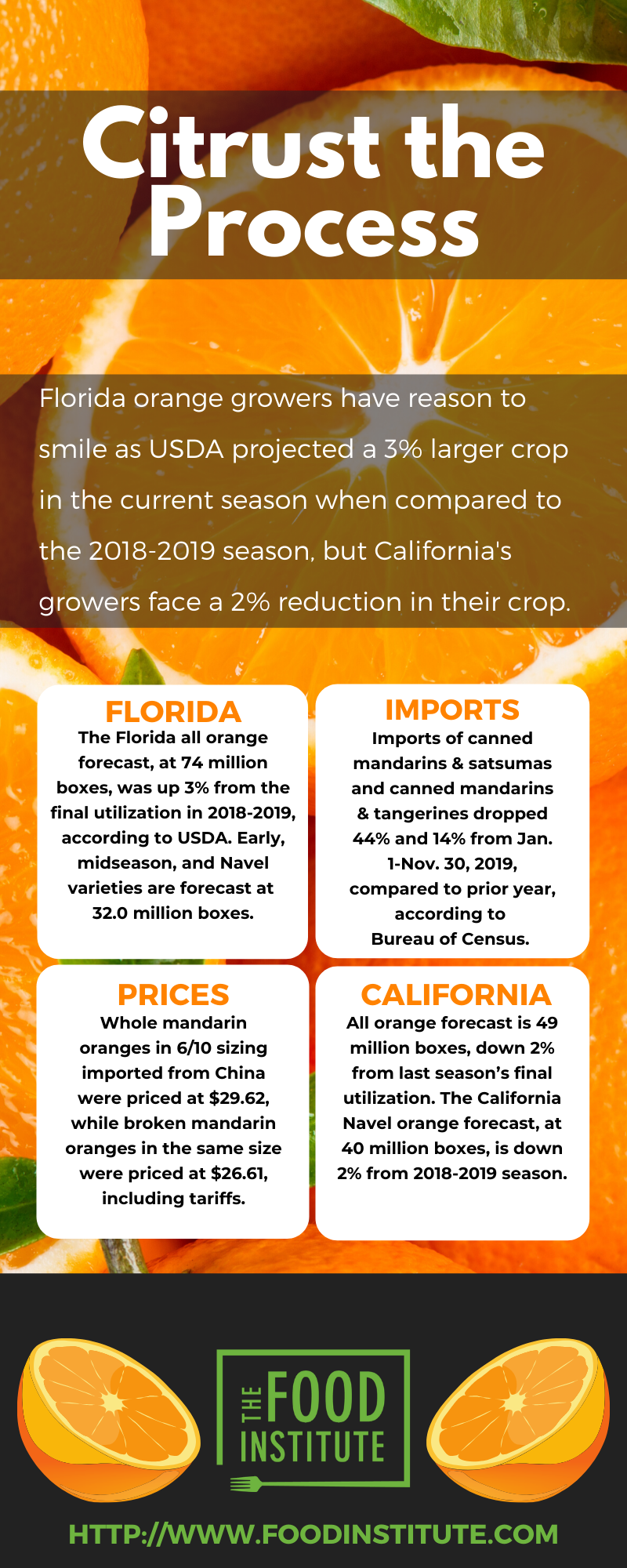 The California all orange forecast was estimated at 49.0 million boxes, up 4% from the previous forecast but down 2% from the prior season's final utilization. The California Navel orange forecast, at 40 million boxes, was up 5% from the previous forecast yet down 2% from last season's final utilization. The California Valencia orange forecast, at 9 million boxes remained unchanged from both the previous forecast and last season's final utilization.