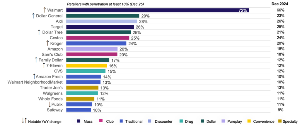 Walmart’s grocery penetration reached a milestone 72% in Dec. 2025, rising six percentage points year-over-year. This is part of a larger shift of mass-channel retailers rivaling traditional supermarkets, with around 79% penetration for both.