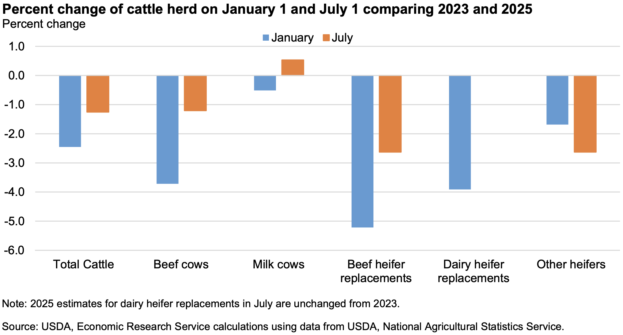 In fact, government data shows that, between 2023 and 2025, the number of beef cows has fallen by a startling amount in both January and July of this year, compared to 2023.