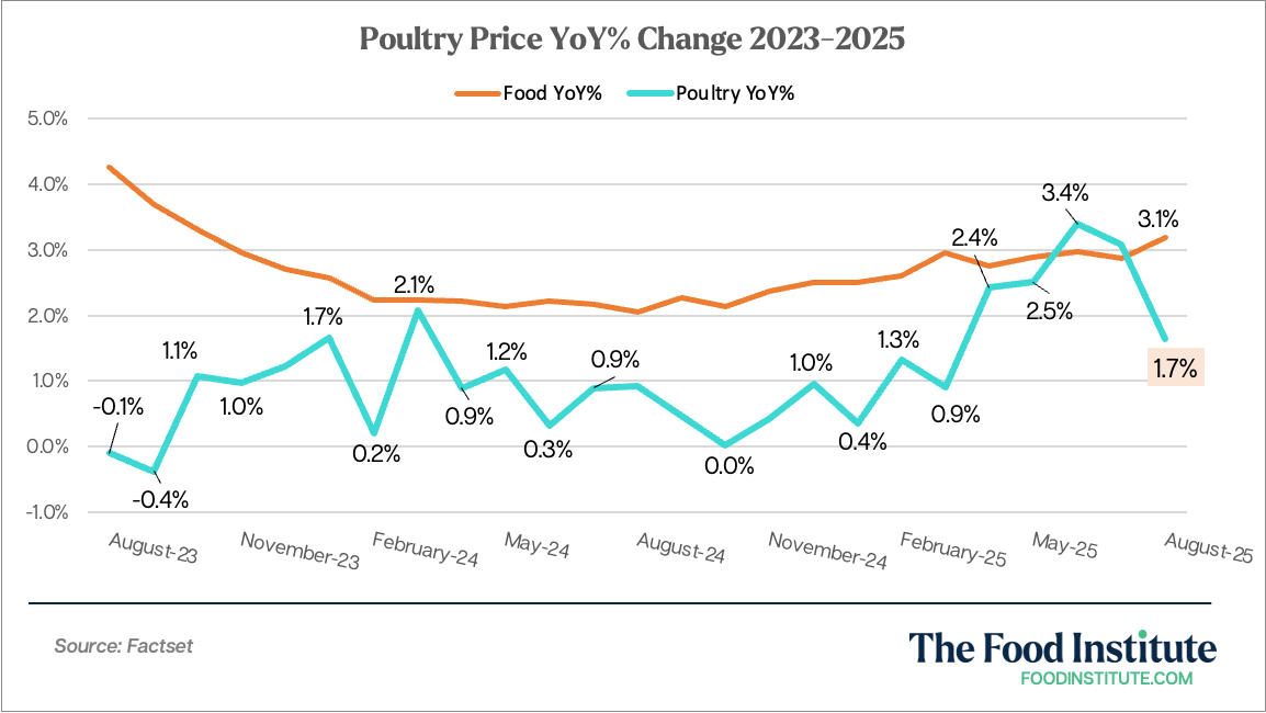 As a result, consumers are pulling back their beef spending, opting for relatively stable alternatives such as poultry or pork. With the exception of June and July, poultry sales have been consistently below the average food inflation rate on a year-over-year basis.