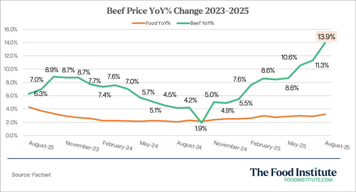 Beef and veal prices were up 13.9% year-over-year in August, after multiple years of record highs, according to consumer price index (CPI) data from the Bureau of Labor Statistics, a marker for inflation.