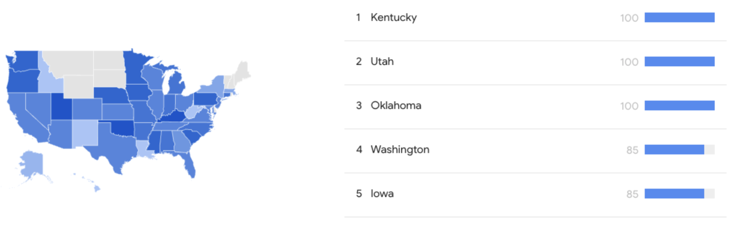 In a Google Trends map tracking search term usage from the last 12 months ending Oct. 7, Kentucky, Utah, and Oklahoma are among the top areas where users are searching the term.
