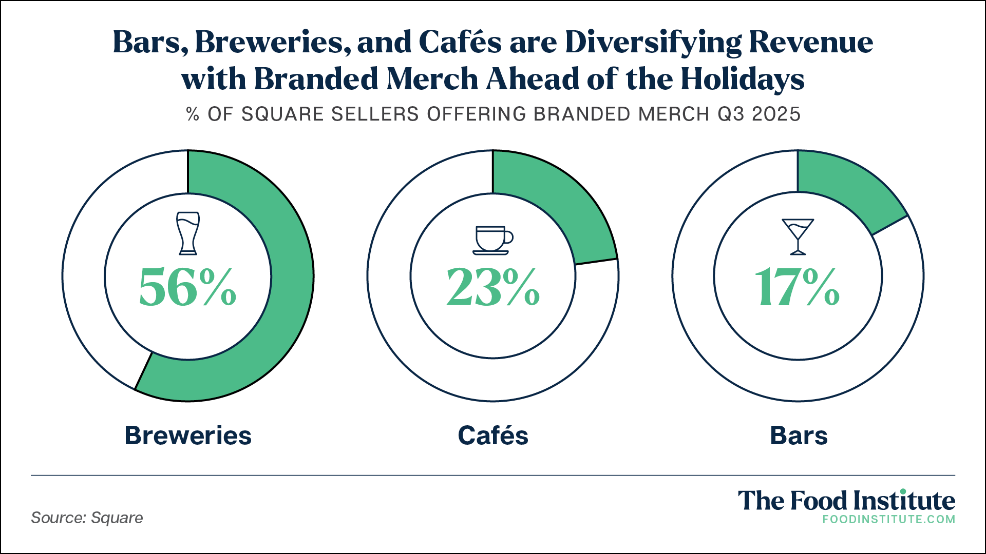 As of Q3 2025, 56.5% of breweries, 22.9% of cafés, and 17% of bars using Square’s payment software are offering merch like T-shirts, hoodies, and hats.