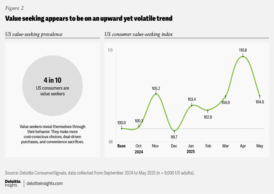 Today, 40% of Americans call themselves “value seekers” who tend to respond to deals and cost-saving measures. Overall, however, value-seeking is up from the beginning of the year.